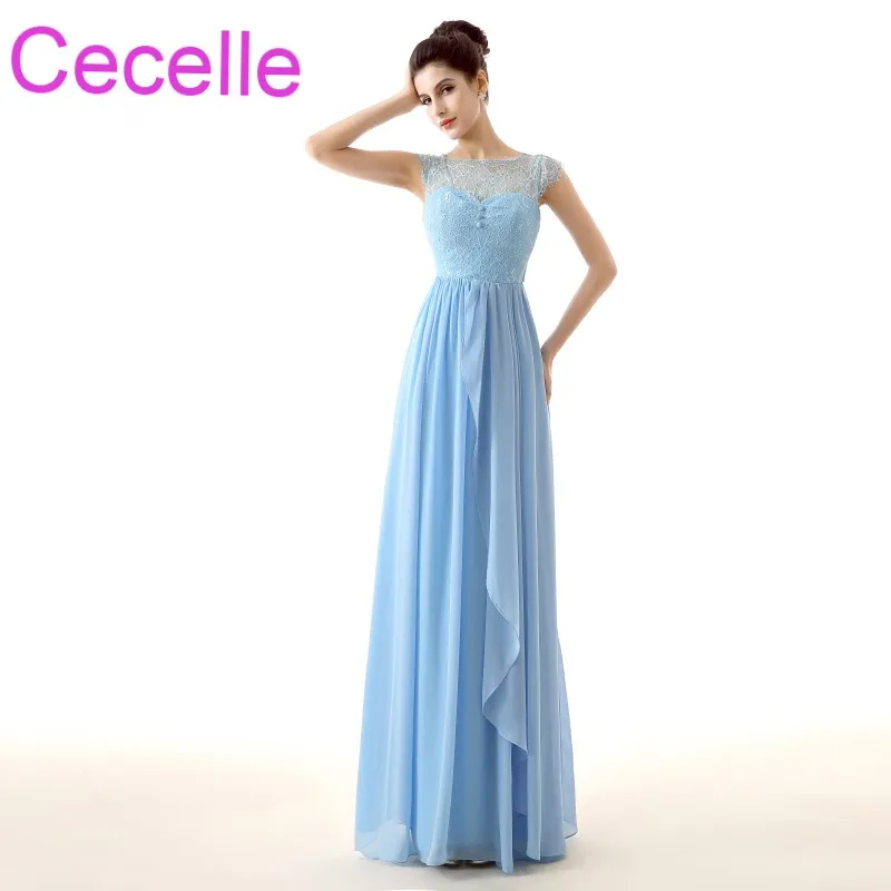 Light Blue Long Beach Bridesmaid Dresses 2018 Cap Sleeves Lace Top