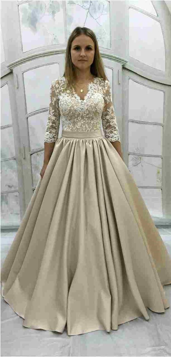 Long Sleeve Beige Lace And Tulle Bridal Evening Dress Vq