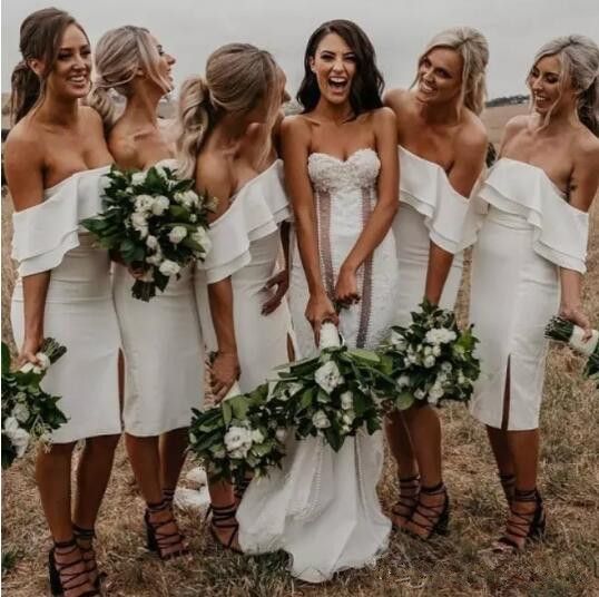 2019 Summer White Boho Beach Bridesmaids Dresses Short Sheath Off Shoulders Pleats Slit Maid Of Honor Gowns Custpm Made Cheap Long Chiffon Bridesmaid Dresses Long Lace Bridesmaid Dresses From Sarahbridal 69 07 Dhgate Com