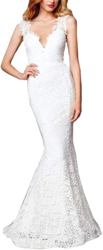 Siqinzheng Mermaid Deep V Neck Lace Wedding Dresses Nude Back