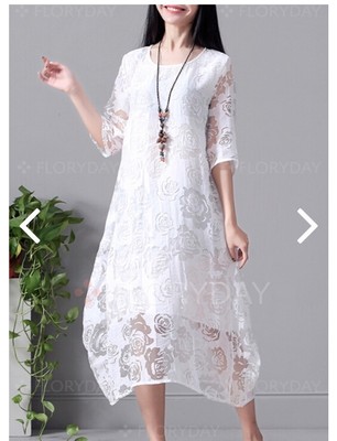 New Floryday White Cotton Linen Lace Midi Floral Dress With