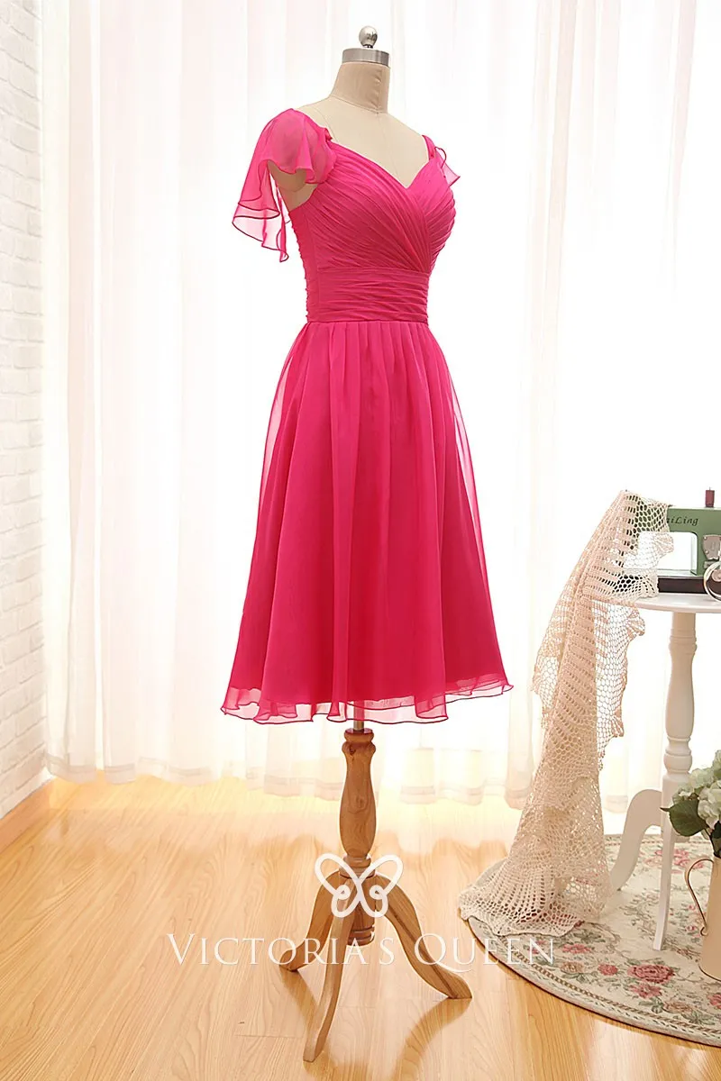 Ruffled Cap Sleeve Fuchsia Short Bridesmaid Dress Vq