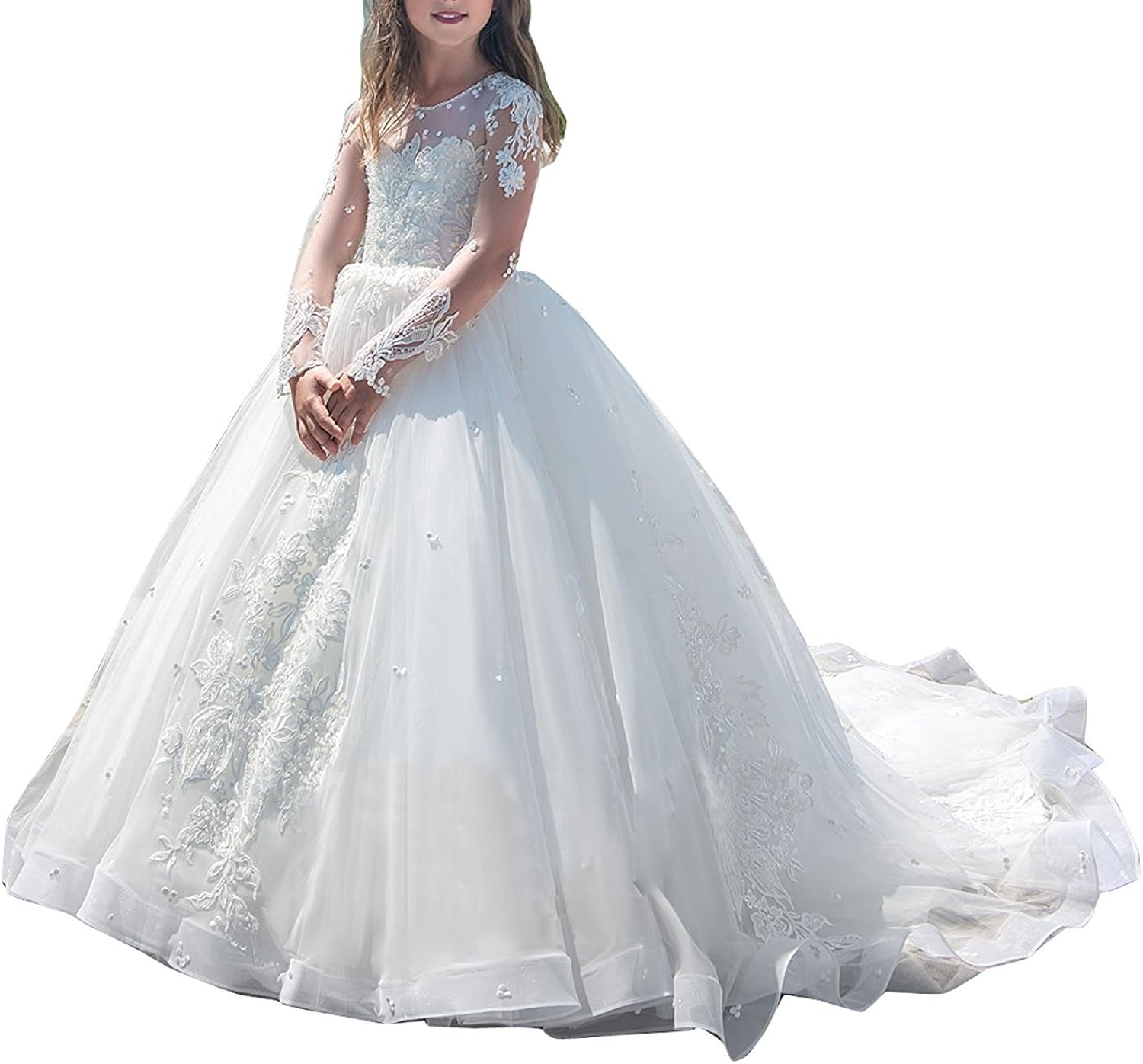 Kengtong Girls Lace Long Train Flower Girl Bridesmaid Dress Party