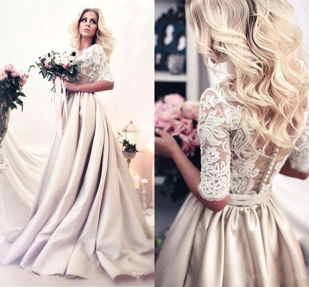 Satin Bateau Neck A Line Wedding Dresses With Lace Half Sleeves