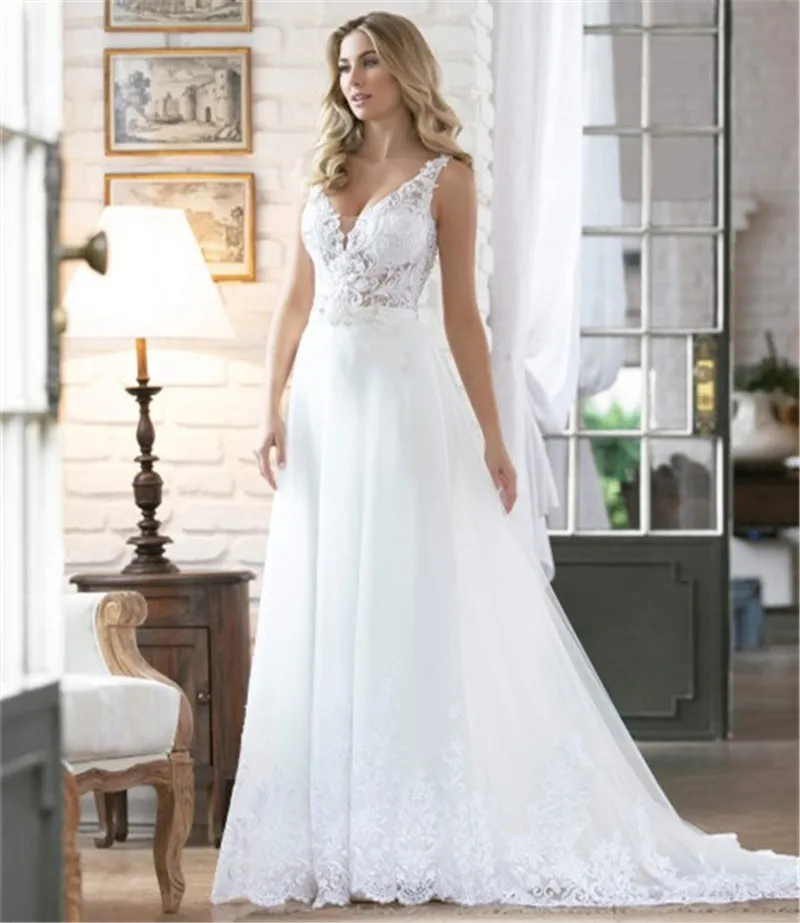 A Line Princess V Neck Chapel Train Wedding Dress With Lace