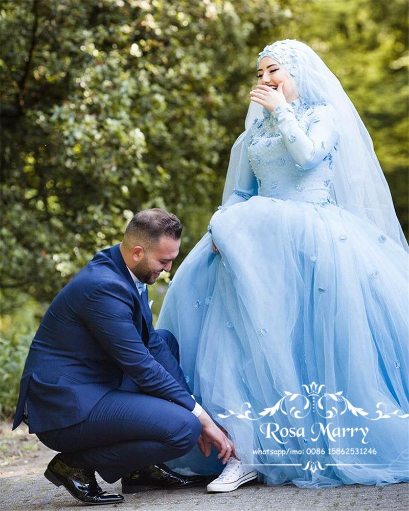 Light Blue Islamic Hijab 3d Floral Wedding Dresses 2020 Ball Gown