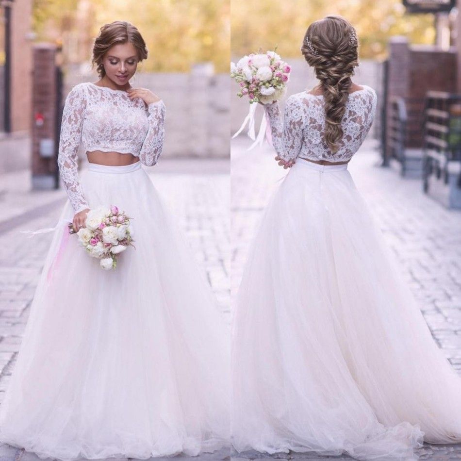 Discount 2020 Boho Wedding Dress Illusion Lace Top Long Sleeve