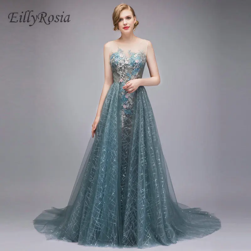 Dusty Gray Blue Illusion Long Chiffon Lace Mother Of The Bride