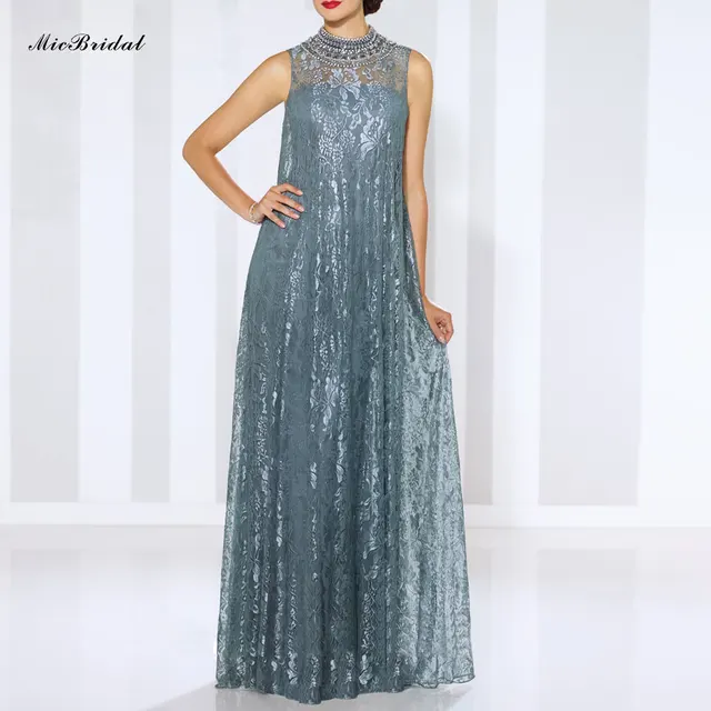 Dusty Blue Lace Long A Line Evening Dresses High Collar 2016 Long