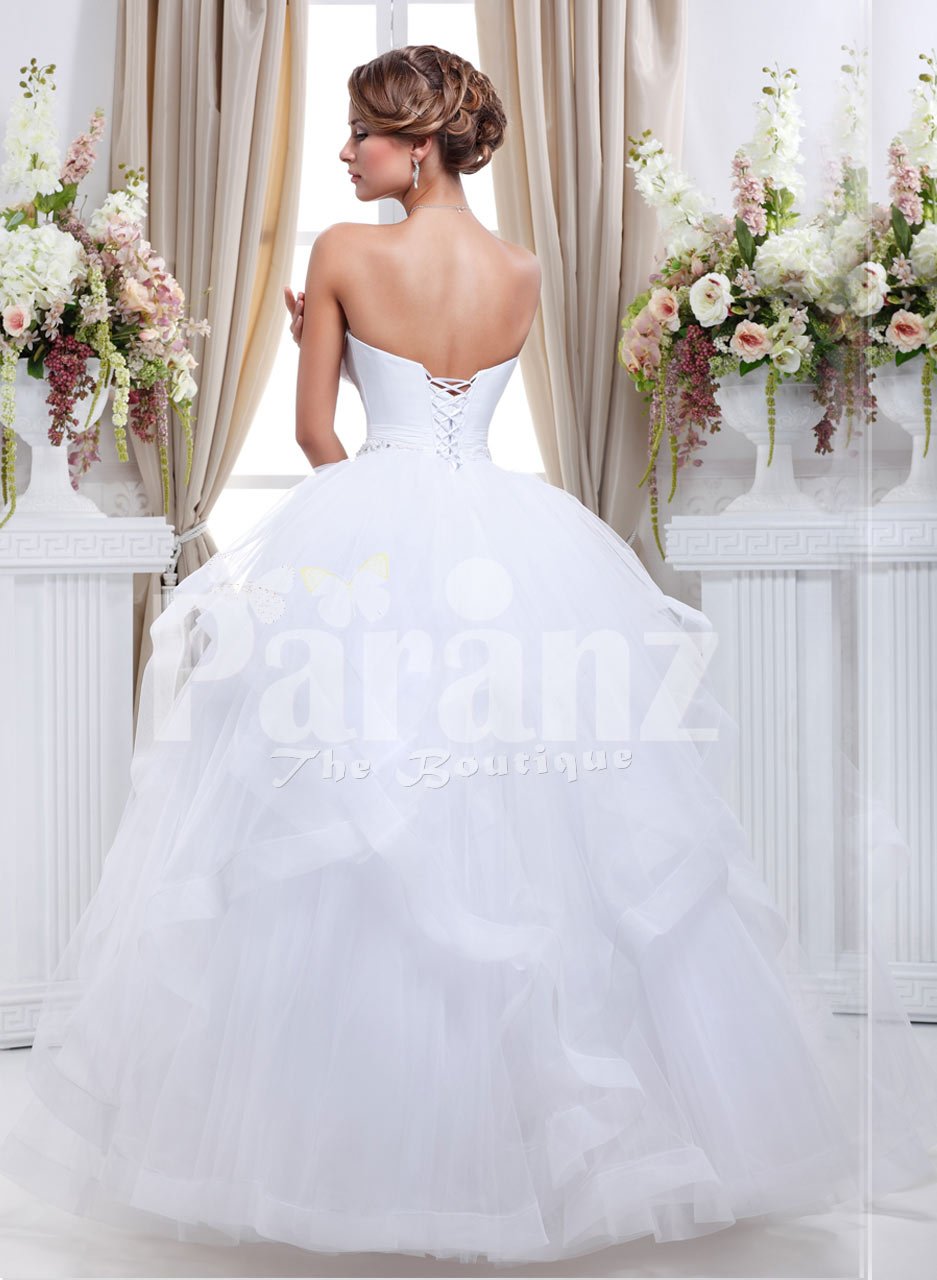 Women S Off Shoulder Pearl White Wedding Gown With Multi Layer