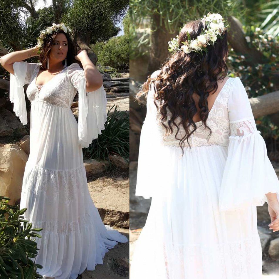 Discount 2020 Plus Size Boho Wedding Dresses A Line V Neck Appliqued Lace Bell Sleeve Bridal Gowns Sweep Train Custom Made Bohemian Wedding Dress Pink Wedding Gowns Shopping Online For Dresses From
