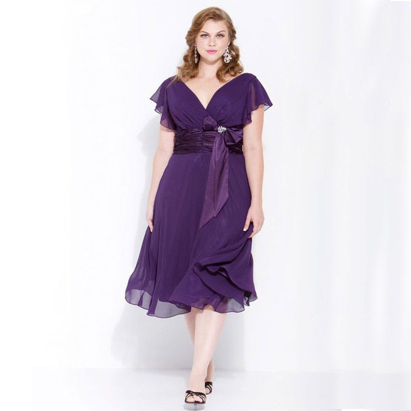 Purple Chiffon Mother Of Bride Plus Size Dresses A Line V Neck Tea