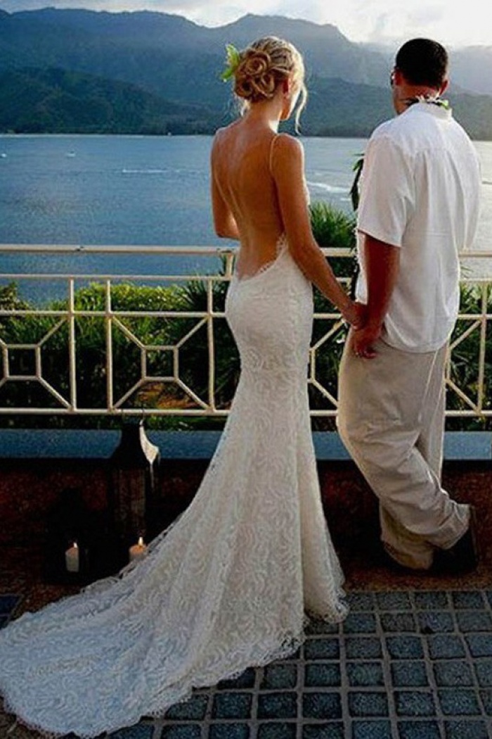 Ivory Lace Applique Backless Sheath Wedding Dress With Train Vampal Dresses
