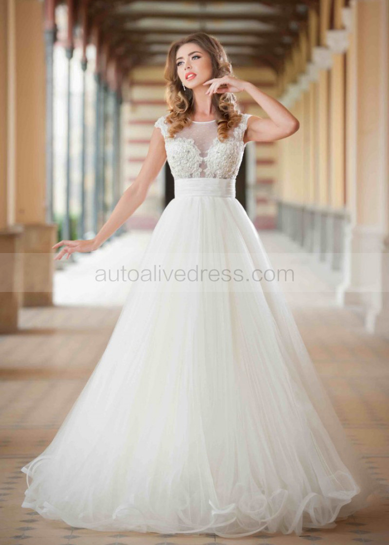 Sheer Neckline Cap Sleeves Ivory Lace Tulle Wedding Dress