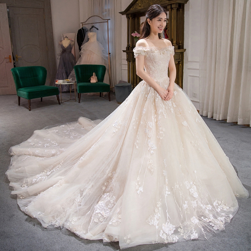 Word Shoulder Wedding Dresses Bride Wedding Thin Long Shopee