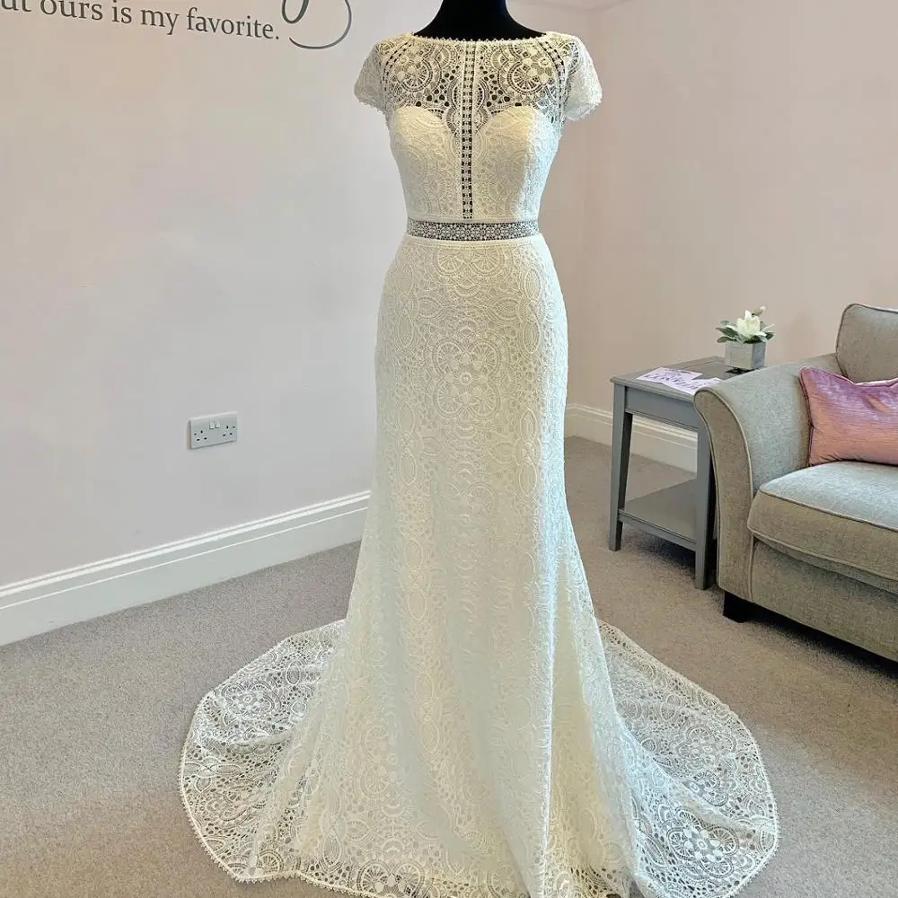 French Lace Bridal Wedding Dress 2019 Sheath O Neck Short Sleeves