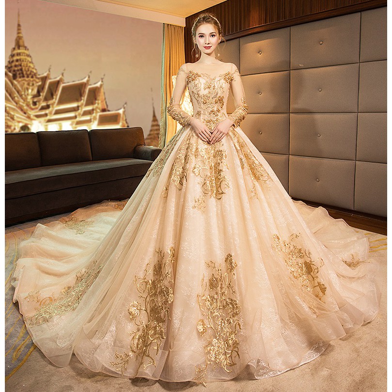 Po Gold White Glitter Long Sleeve Fishtail Wedding Bridal Dress