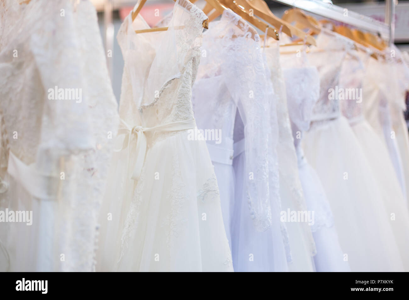 White Wedding Dresses Hang On The Counter In The Store Stock Photo